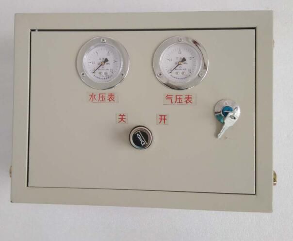 ZPFS氣控式風水聯(lián)動噴霧降塵裝置控制箱(以下簡稱控制箱)采用內(nèi)置風、水控制閥對裝置用風、水壓力進行調(diào)控,對風水比例進行均衡,采用氣控閥(控制箱圖片上的“開關(guān)”)控制噴霧裝置的開啟與關(guān)閉。控制箱門扇上鑲嵌氣控閥(開關(guān)旋鈕)控制噴霧裝置的開啟與關(guān)閉,鑲嵌有水壓表、氣壓表,分別顯示調(diào)控后的水、氣壓力。